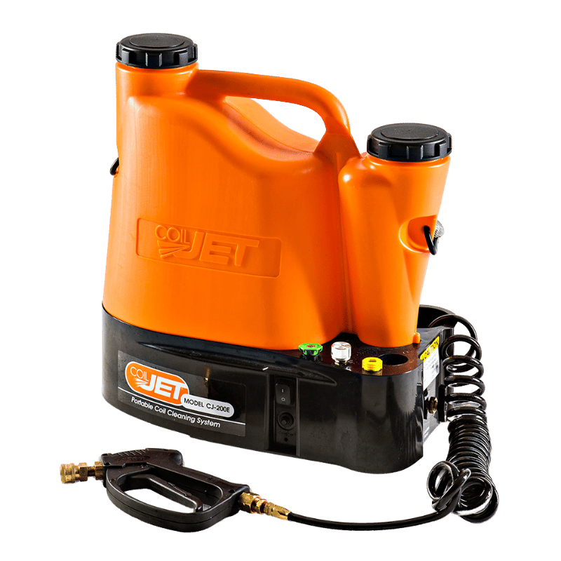 The CJ-200E CoilJet® electric portable HVAC coil spray cleaner. The 110 VAC system carries all the water and coil cleaner you need to clean up to five, 5 Ton units using 220 psi pressure at 0.5 GPM. The system has a water capacity of 3.375 Gal and chemical capacity of 1.75 qt. It applies coil cleaner and then flush with fresh water, quickly clean coils without damage to sensitive fins, even microchannel coils. Includes 2 standard spray nozzles, spray gun with quick disconnect, 15 ft power cord, and shoulder strap.