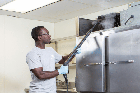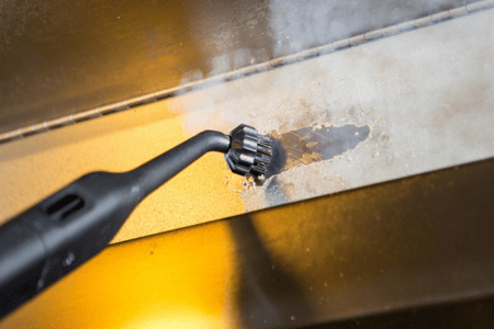 - Uses 235 degree dry steam to remove oils and dirt and leaves surfaces clean and sanitized.