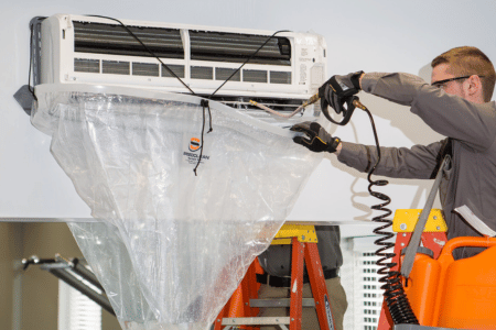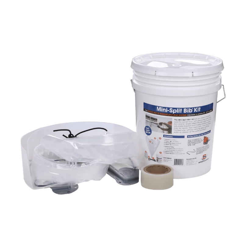 The MSB-KIT Mini-Split Bib Kit from SpeedClean® quickly attaches to mini-split systems up to 44 inch wide using special brackets. Using the custom bib section to create a barrier against the wall and other surroundings so that you can effectively clean the coils, fan blades and more with pressurized cleaning systems, like pump sprayers or our CoilJet® portable coil cleaning system. The kit includes bib, adjustable mounting brackets, adhesive wrap and 5-gallon bucket. The funnel directs all water and chemicals into 5-gallon bucket for proper disposal and to keep walls and floor safe from water and over spray.